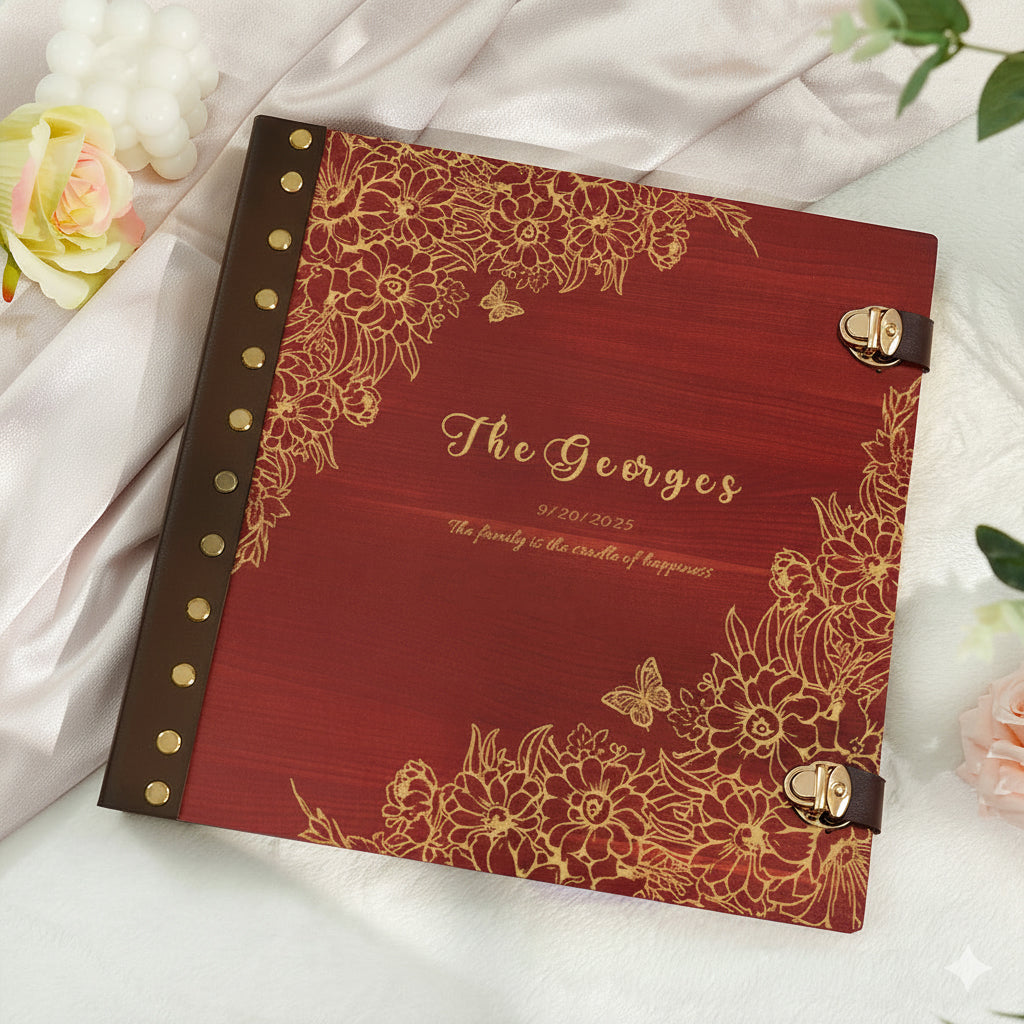 Wooden Photo Album with Carved Flowers and Engraved Names