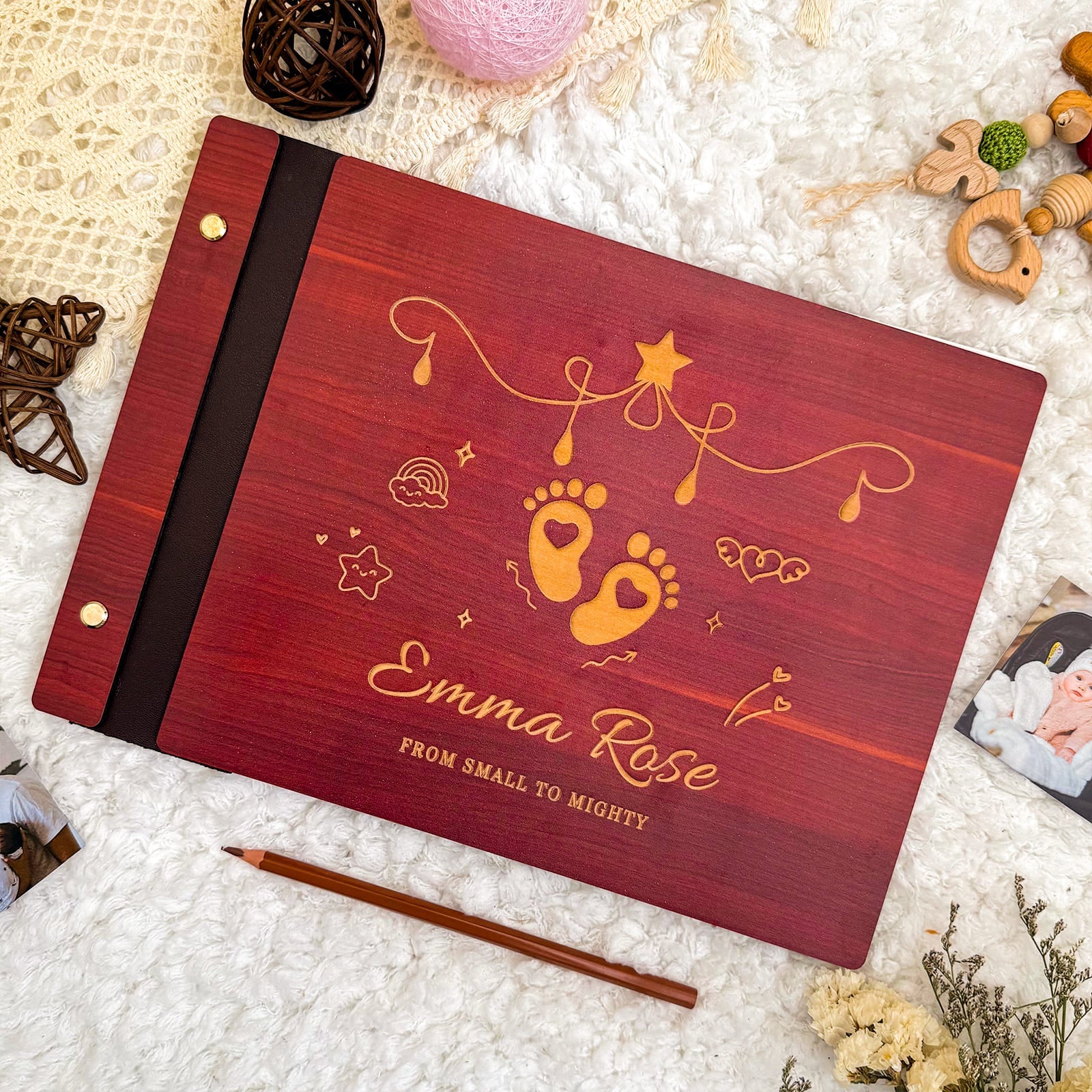Celebrate your little one’s first memories with our handcrafted personalized wooden baby photo album. Made from premium solid wood, this elegant scrapbook features a laser-engraved footprint design, your baby’s name, and birth date – creating a timeless keepsake for photos, milestones, and precious moments. Perfect as a newborn gift, baby shower present, or christening keepsake, this custom album blends natural beauty with heartfelt personalization. Preserve every smile, tiny hand, and cherished story in a book that grows with your child.